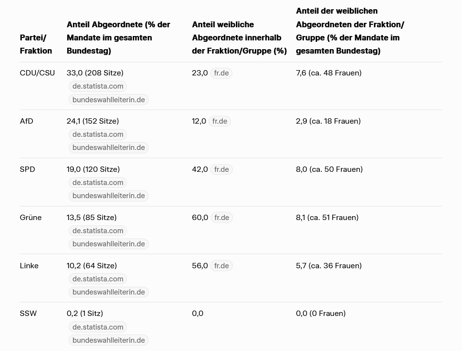 Übrigens schreibt FAZ es befänden sich „nur“ 32,4% Frauen im Bundestag. Ich habe einmal Grok gefragt und da kam heraus: Der Mitgliederanteil über die Parteien hinweg ist 31,8% Frauen und 68,2% Männer, bei Rund 1,2 Mio Parteimitgliedern. Werden also Frauen mit Männern gleich behandelt?